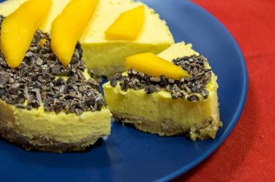Desmoldamos y servimos con unos trozos de mango fresco y un poco de cacao.